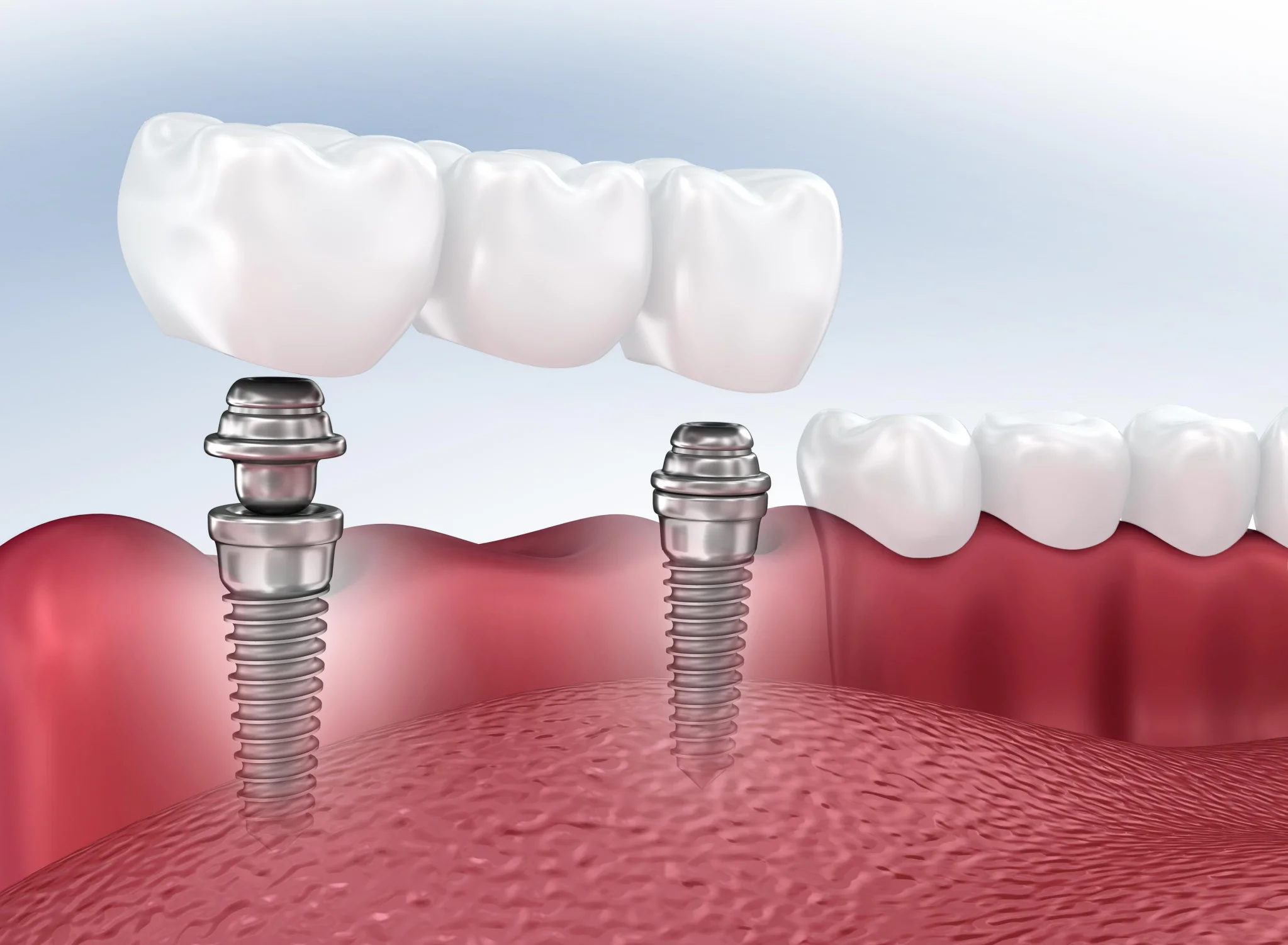 Im Folgenden sind verschiedene Anwendungsbereiche schematisch dargestellt. Die Bilder sind vereinfacht und spiegeln nicht zwingend die Art und benötigte Anzahl der Implantate wider – hier steht immer Ihre individuelle Situation im Vordergrund. Darüber hinaus existieren weitere sinnvolle Einsatzgebiete, bei denen wir Sie gerne beraten.Einzelzahnlücken können sich in der Regel sehr gut durch ein eigenständiges Implantat mit einer Krone als Aufbau schließen lassen. Gerade im Frontzahnbereich kann sich durch ein Implantat eine deutlich bessere Ästhetik ergeben als durch die konventionelle Versorgung mittels einer an den Nachbarzähnen befestigten Brücke. Zusätzlich müssen zum Schließen einer Einzelzahnlücke mittels eines Implantats keine gesunden Nachbarzähne beschliffen, werden, wie es für eine Brücke notwendig wäre.